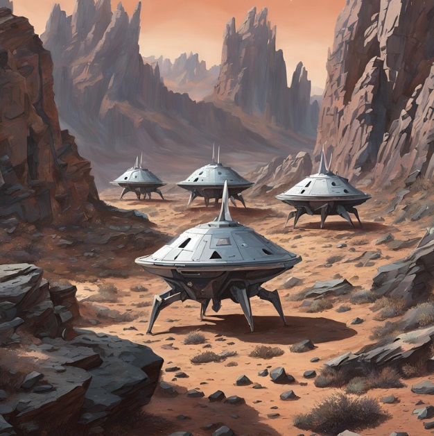 Abandoned ships are, however, generally perfectly structurally sound, and the durable walking landing gear almost always works just as well as the day the ship first broke anchor. This has lead to a very curious effect on many a rough world on the frontier where dozens or hundreds of grounded starships can be seen walking from one settlement to the next, driven by ship herders in massive, bizarre trade caravans.
